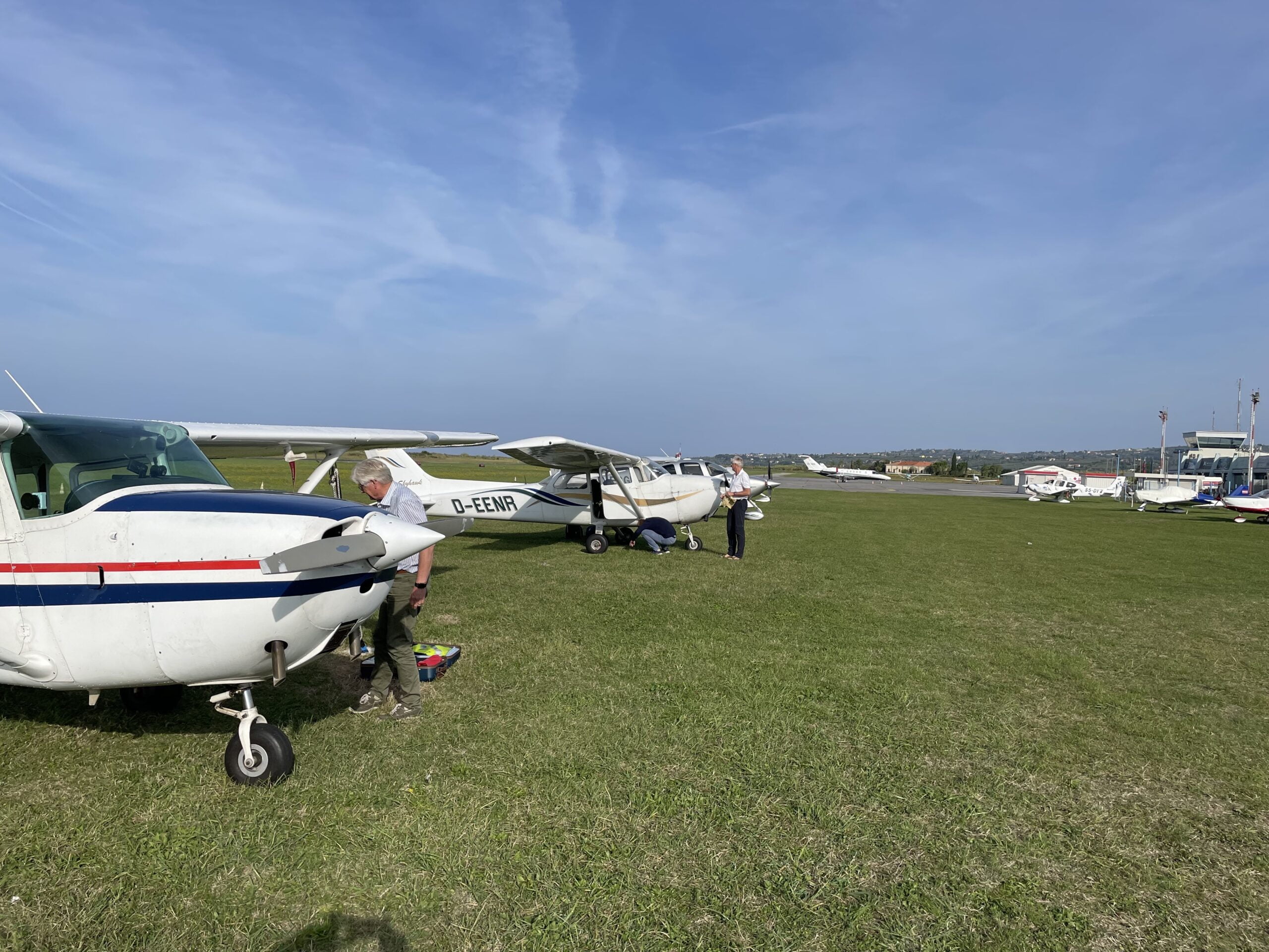 Nach einigen Abenden und viel Messenger Texten waren wir eine Gruppe von 6 Piloten und 3 Flugzeugen. Zwei 172er und eine Piper Arrow. Dirk, Andre, Sascha, Klaus, Tobias und ich, alle organisert im Frankfurter Verein für Luftfahrt in Egelesbach (EDFB). Mein ehemaliger Fluglehrer Dirk und Klaus, auch als Fluglehrer im FVL engagiert, waren die erfahrensten Piloten und immer eine große Stütze in allen Fragen des Fliegens, aber auch der Meterologie auf unserer Reise.