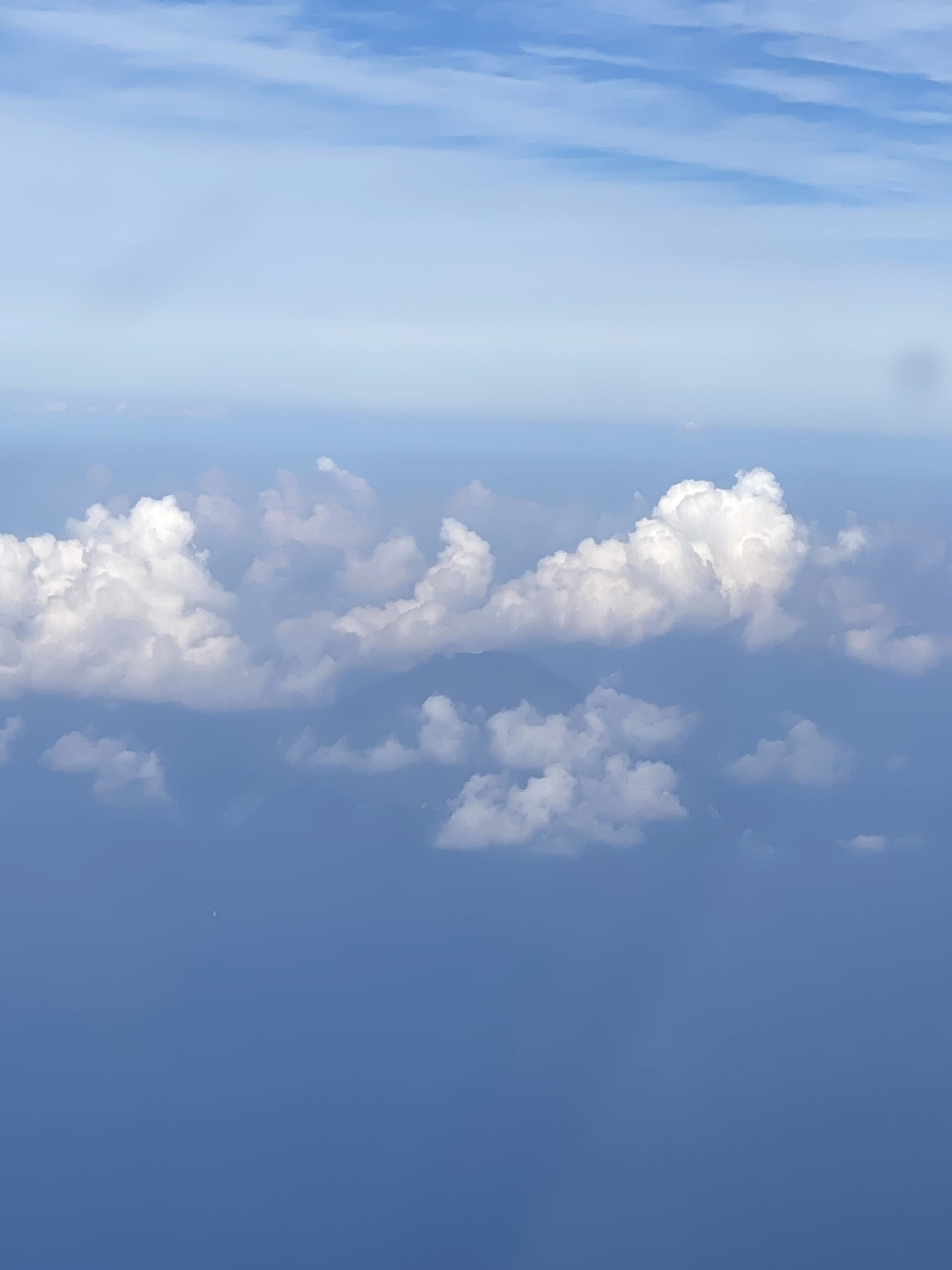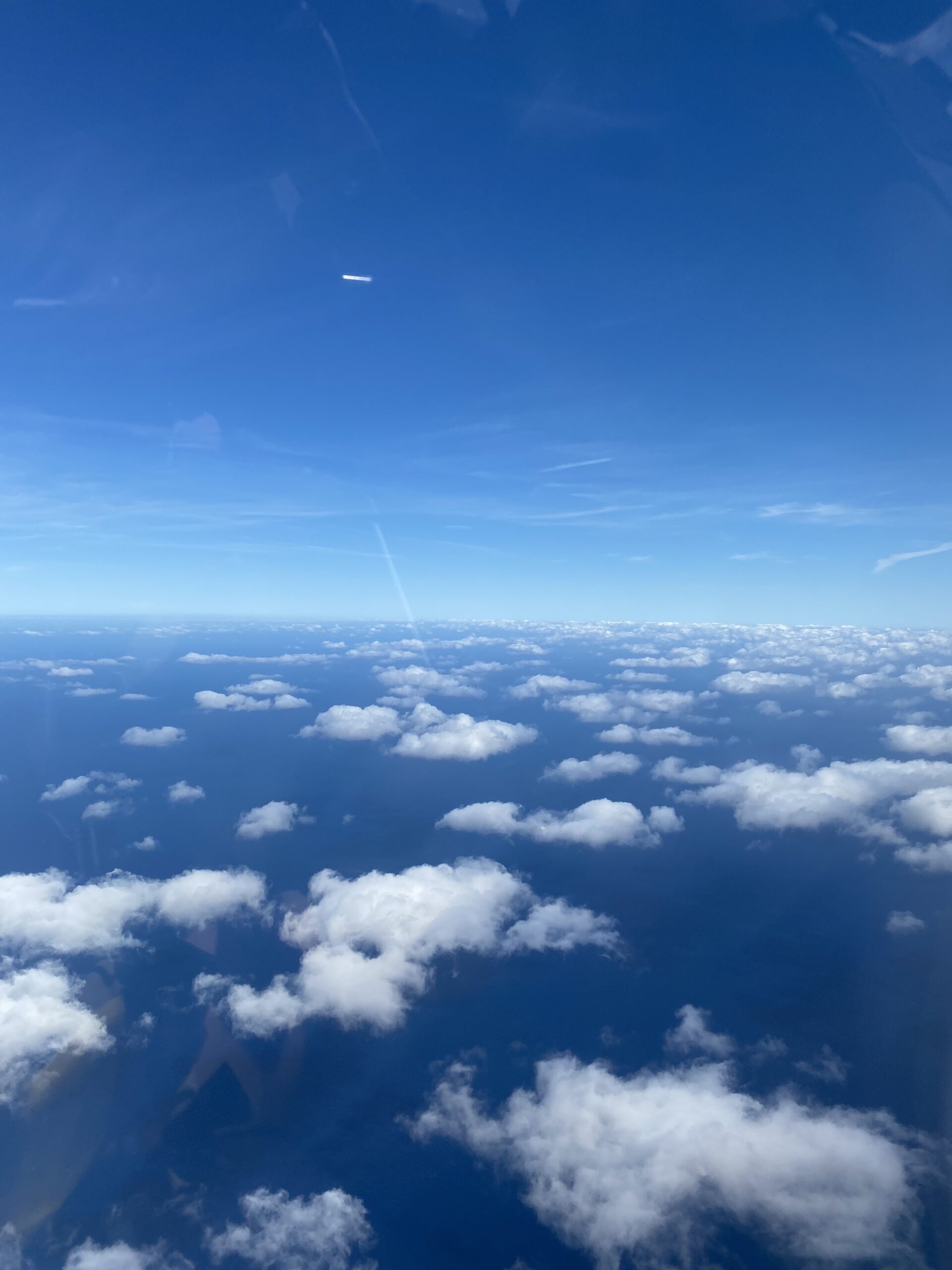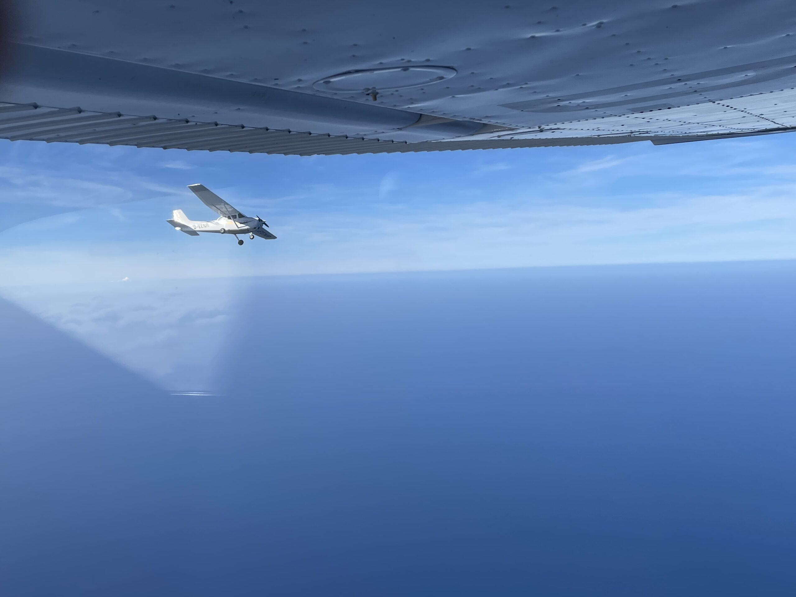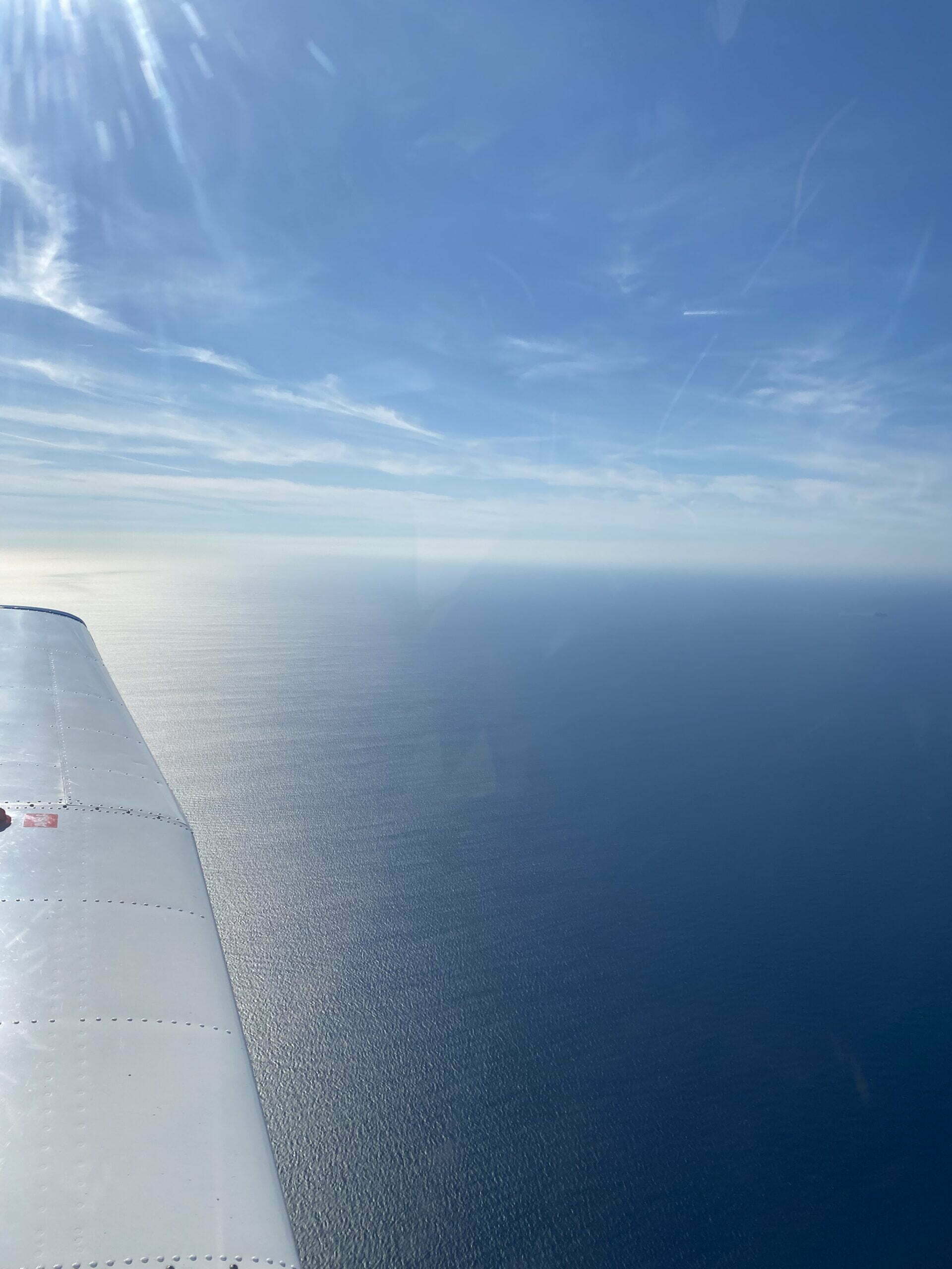 Der Flug verlief ruhig und reibungslos. Eine gewisse Zeit mussten wir auf Funk verzichten, da wir wohl außerhalb der Reichweite waren. Mit jeder Meile weiter auf dem Meer stellte sich bei mir eine Ruhe ein. Die Anspannung viel ab und ich konnte mich an dem endlosen Blau des Meeres, welches am Horizont in den Himmel überging, nicht sattsehen. Dazwischen strahlend weiße Wolkengebilde. Wie schön das doch alles ist und wie unendlich groß und erhaben. Wie klein dagegen unser Flugzeug am endlosen Himmel… . Solche Momente kann ich genießen, schließe Sie fest in meine Erinnerungen ein und kann lange davon zehren.