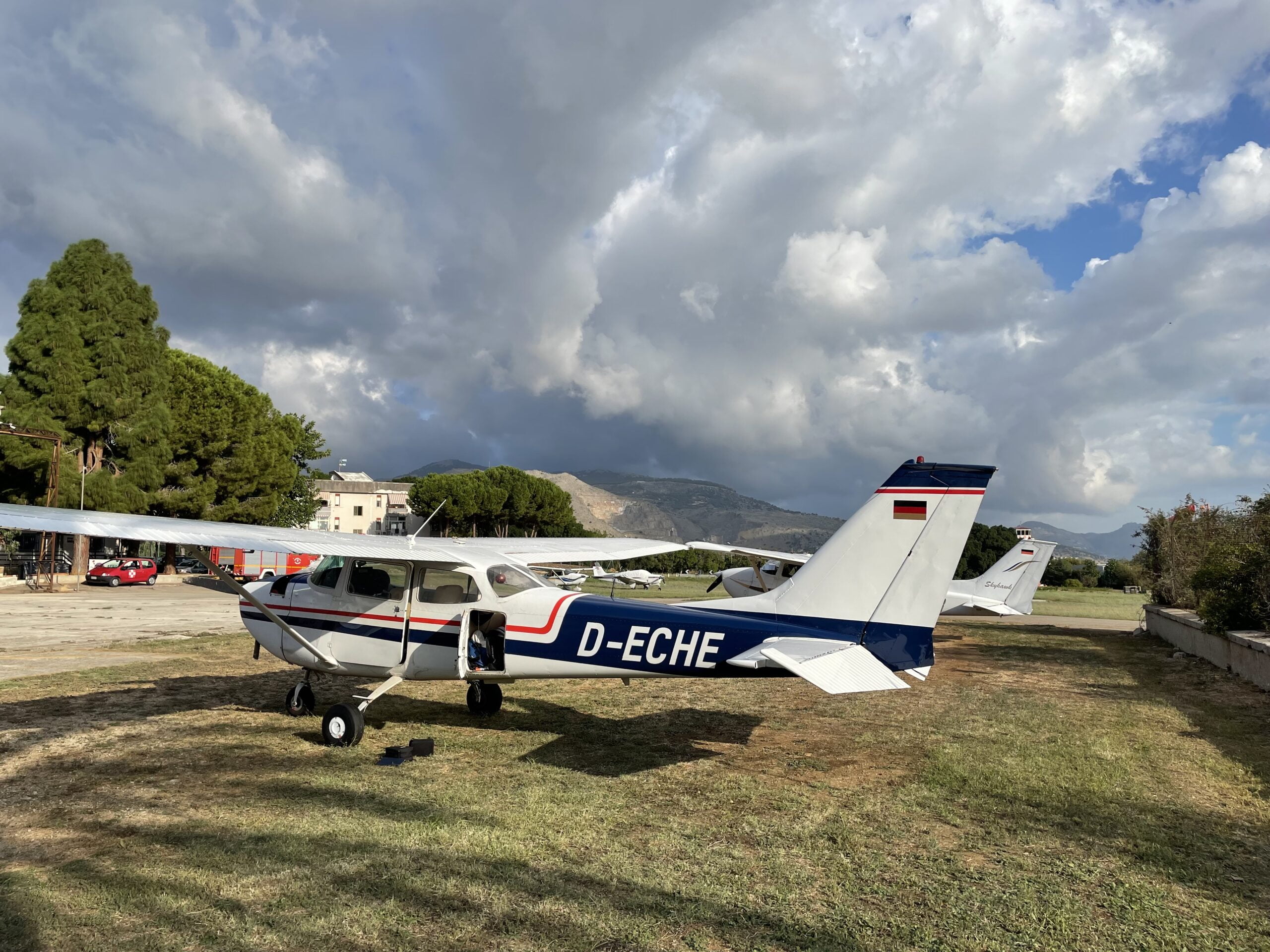 „Bad Weather condition, IMC ab 1400Fuss near Palermo”! “Please follow the coastline to Bocca di Falco” die direkte  Anweisung des sehr bemühten Controllers. Von 8000Fuss kommend stürzen wir unsere Maschine auf 900 Fuss runter und befolgen angespannt den Anweisungen unseres Controllers. Es wabern dichte Wolkenfelder in den Tälern und mehr als die Küstenlinie ist oft nicht zu sehen, aber wir fliegen dicht über dem Meer die Küste Siziliens entlang, bekommen die Freigabe den Internationalen Flughafen zu queren und direkt über Palermo den Flughafen anzufliegen. Kurz bevor der Regen einsetzt und alles in Wolken verschwindet setzten wir mit unserem Flugzeug sicher auf der Piste auf und werden vom Aeroclub Palermo empfangen. Wenig später kommen die 2 anderen Maschinen ebenfalls sicher an. Wir steigen aus, ein leichter Nieselregen setzt ein, aber es ist uns egal. Wir sind erschöpft, aber glücklich und fallen uns in die Arme. Der südlichste Punkt unserer Reise ist erreicht und wir haben das geschafft, was wir uns vorgenommen haben. Ein bisschen, ein ganz kleines bisschen sind wir auch stolz auf uns…