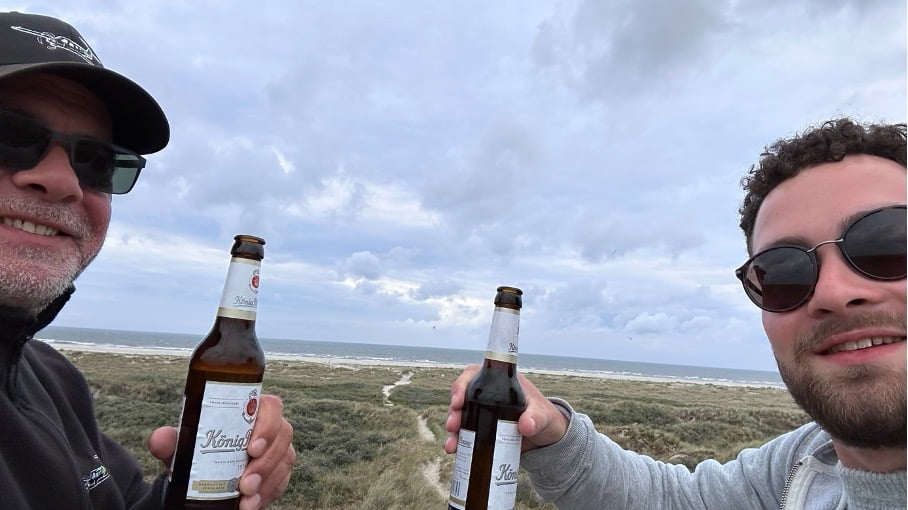 Der Flug über Calais nach Juist immer der Küste entlang, aber auf dem Meer war wunderbar. Wolkenformationen, Schiffe, die Küste, man kann einfach nicht genug davon bekommen. In Juist angekommen, haben wir noch etwas am Flughafen gegessen und unser Zimmer in der Jugendherberge bezogen. Noch mit 2 Bier bewaffnet haben Vater und Sohn in den Dünen den Tag ausklingen lassen.
