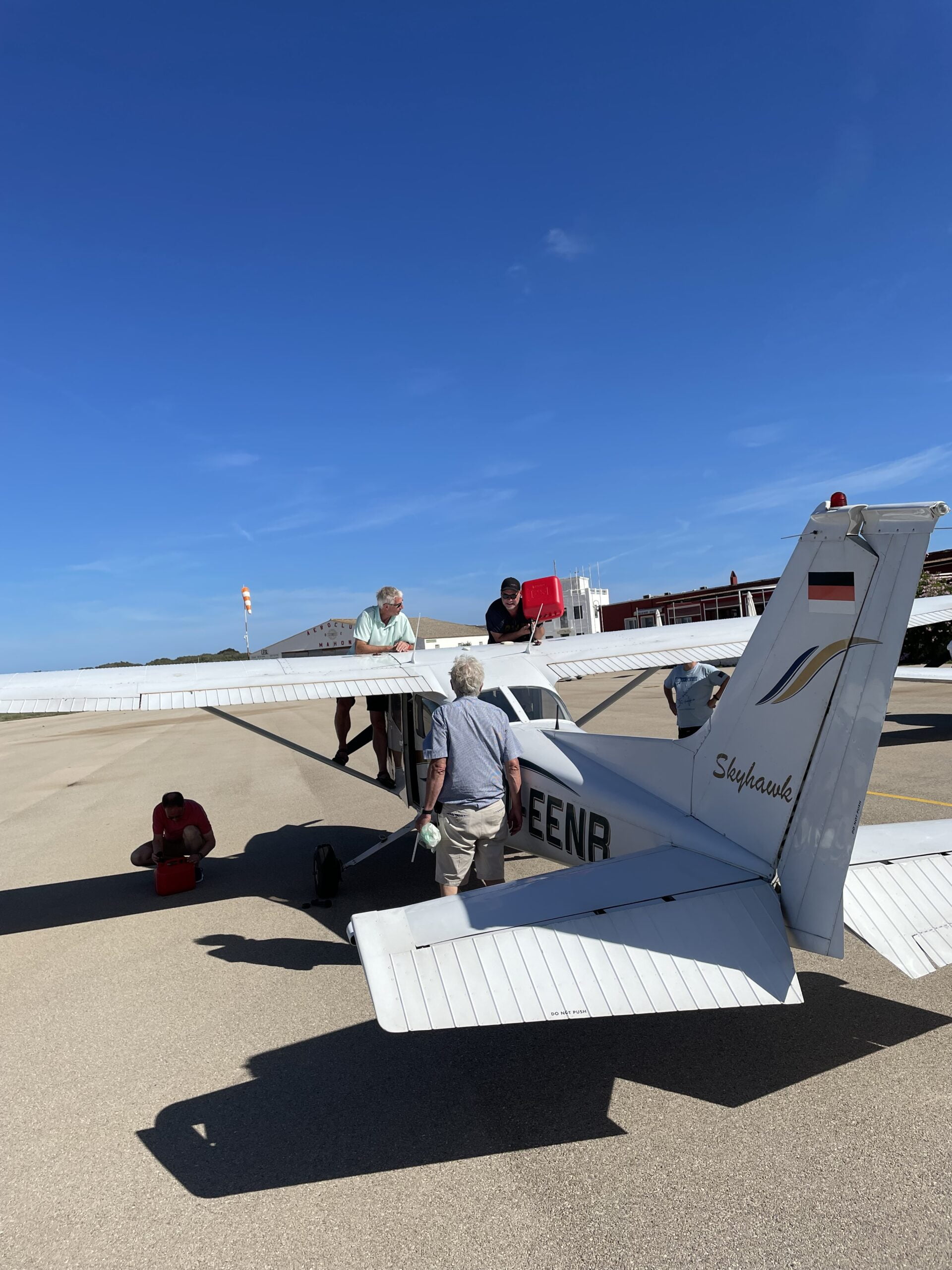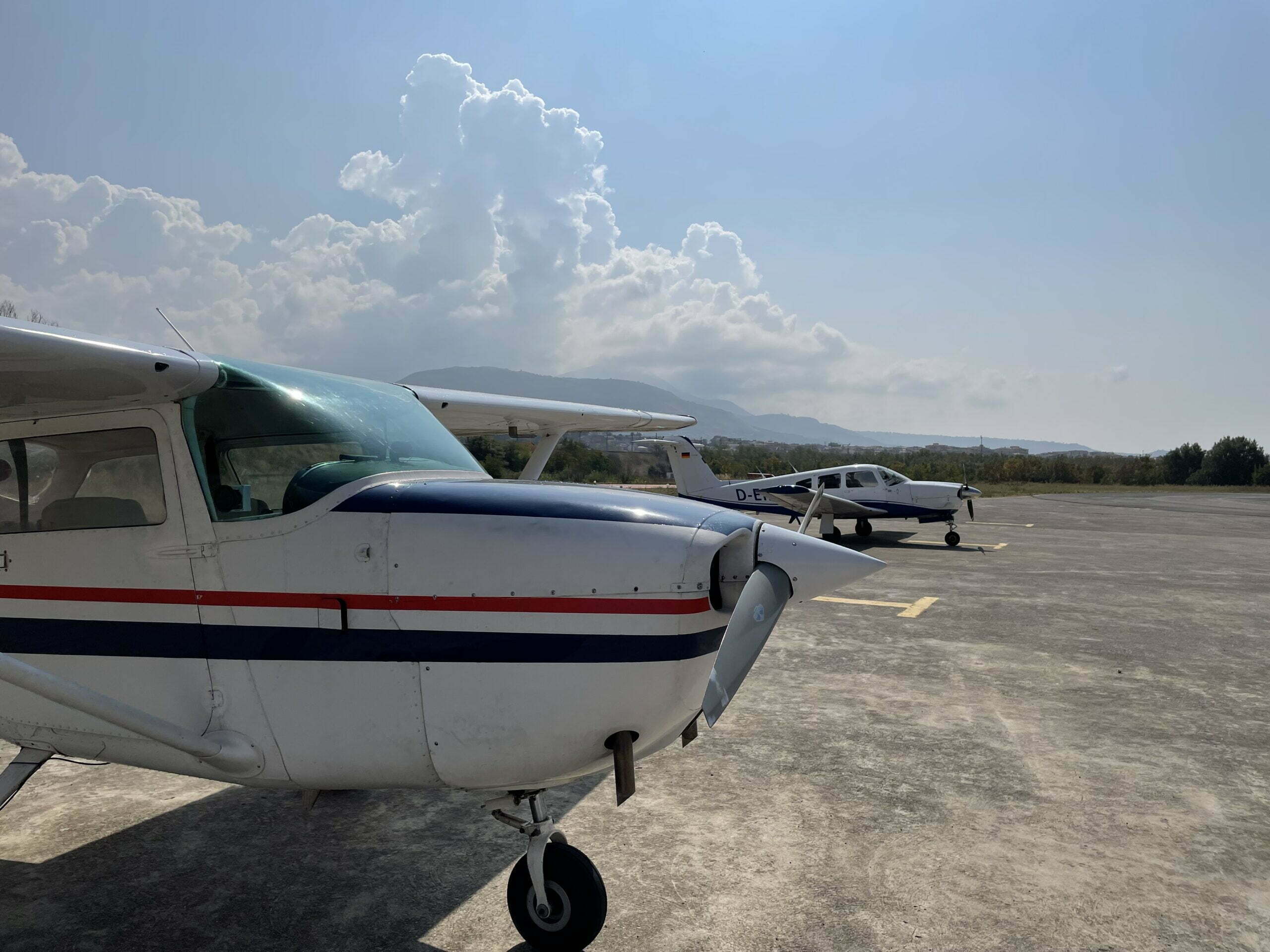 Eine dieser Herausforderung war der lange Flug von Mallorca über Sardinien nach Palermo. Die Herausforderung war zum einen das genaue Berechnen des Verbrauchs und der Endurance, wann ist der „Point of no Return“ erreicht, wie verhalten wir uns, wenn eine Maschine in Schwierigkeiten gerät, was passiert im Notfall. Viele und lange Diskussionen, viele Berechnungen, viele Zweifel, aber auch Abenteuerlust in den Augen der Freunde. Letztendlich waren die Tatsachen geklärt. Ein Tankstopp auf Menorca sollte alle Zweifel beseitigen. Das ist die eine Herausforderung, die andere ist die mentale. Mit einer Ein-Mot 2-3h über das offene Meer. Ist das Risiko kalkulierbar? Weiß der Motor, dass wir über dem Meer fliegen und das eine Notwasserung bei Maschinenproblemen der letzte Ausweg wäre? Wie sinkt ein Hochdecker und wie sinkt ein Tiefdecker? Was geht in unseren Köpfen vor und wie unterschiedlich sind die Einschätzungen der Risiken. Es war ein anstrengender Abend, der die gesamte Crew in 2 Lager spaltete, aber letztendlich dazu führte, dass man die geplante Route umsetzten wollte. Am nächsten Morgen wurden an der Tankstelle Kanister gekauft und betankt, die Flugzeuge nochmal eingehend begutachtet und gecheckt und los ging es nach Menorca. Die einen mit der Abenteuerlust in den Augen, die anderen vielleicht mit dem ein oder anderen leichten Zucken in der Magengegend. In Menorca angekommen, betankten wir die 172er mit dem mitgebrachten Treibstoff aus den Kanistern bis kein Fingerhut Luft mehr in den Tanks Platz hatte. Noch ein letztes Händeschütteln, noch ein Lachen und ein „guten Flug“ an die Freunde und wir rollten auf.